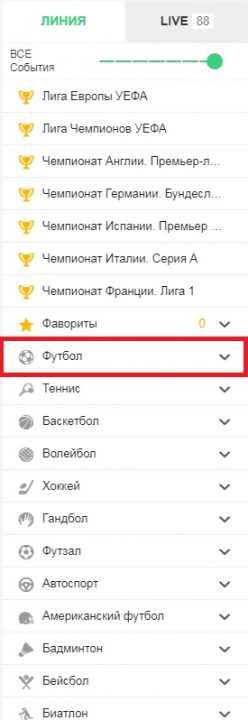 Шаг 1. Сначала нужно выбрать вид спорта. Для этого ознакомьтесь с меню, которое доступно справа. После чего выберите мышью интересующую дисциплину.