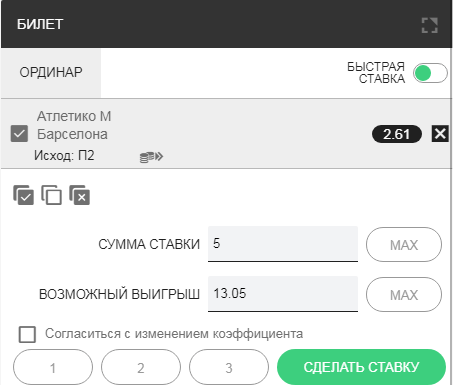 Шаг 4. После заполнения купона, следует еще раз проверить все указанные в нем данные. Если все верно, то кликните на «Сделать ставку». После этого действия у вас уже не будет возможности вносить изменения в данный купон, как и удалить его. Чтобы ознакомиться со всеми заключенными пари, достаточно перейти в меню «История».