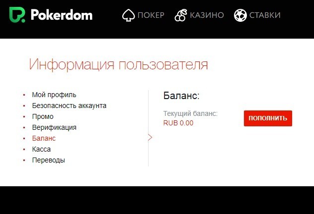 В этом разделе отображается актуальный баланс покериста. Здесь же доступна кнопка «Пополнить». Нажав на нее, вы будете перенаправлены во вкладку для внесения средств на счет своего аккаунта.